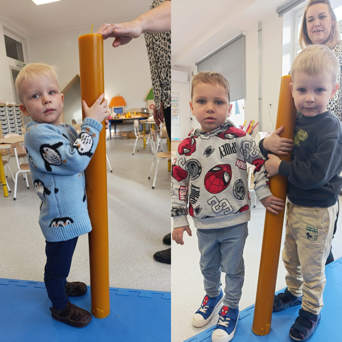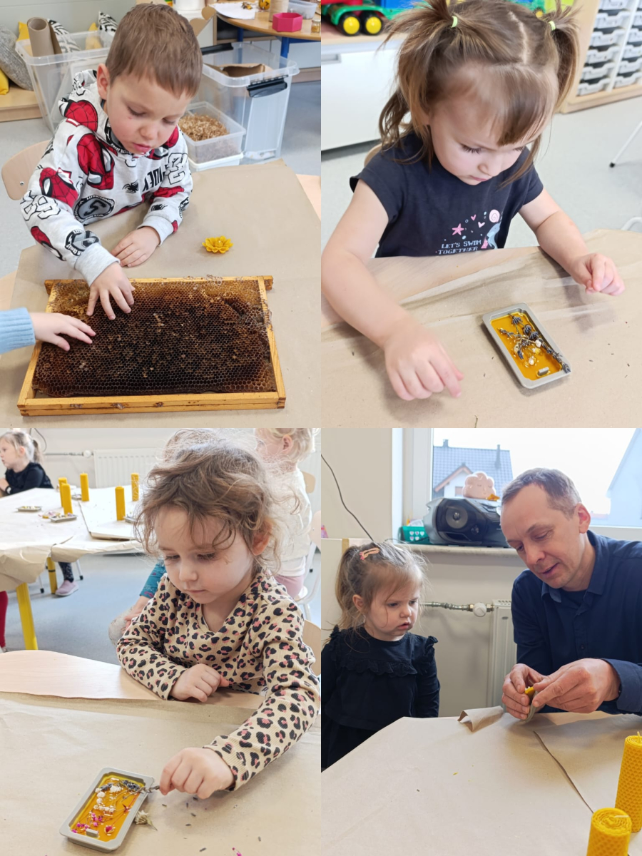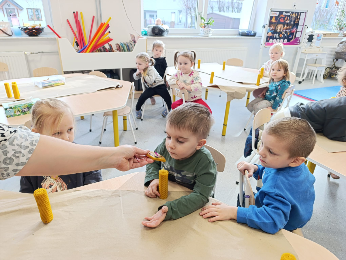 Dwie najmłodsze grupy przedszkolne uczestniczyły w warsztatach podczas których poznały wygląd pszczół i dowiedziały się jak można wykorzystać pracę tych zwierząt w życiu codziennym. Prowadzący zajęcia Pan Karol opowiedział dzieciom jak powstaje miód i wosk pszczeli. Działania jakie podejmowały dzieci oddziaływały na ich zmysły. Mogły dotykać gotowych świec i ramki z miodem pszczelim. Smakować i wąchać zapach miodu oraz suszonych ziół, obserwować zastyganie płynnego wosku i zatapiać wybrane kwiaty w zawieszce woskowej. Były to niecodzienne doświadczenia, a nasze przedszkolaki były zaciekawione, cierpliwe i postępowały bardzo ostrożnie podczas wykonywania świec różnymi technikami. Wspaniałe zapachy i wspomnienia tych zajęć na długo pozostaną w naszych salach.