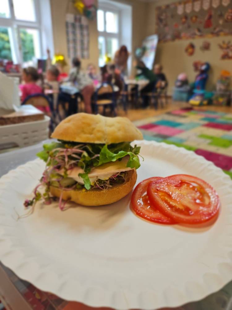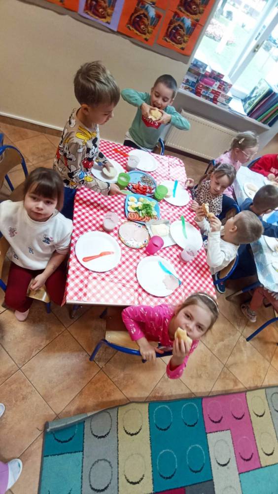Piątek był najsmaczniejszy! Dzieci samodzielnie przygotowywały zdrowe, kolorowe śniadanie: kakao, malinowa herbata, świeże warzywa, jajka, sery, kiełki i świeżo wyciskany sok z pomarańczy. Każdy mógł spróbować czegoś nowego, a kanapkowy zawrót głowy wywołał mnóstwo uśmiechów! Na koniec dzieci otrzymały sylwetę brokułka do kreatywnej pracy plastycznej w domu.