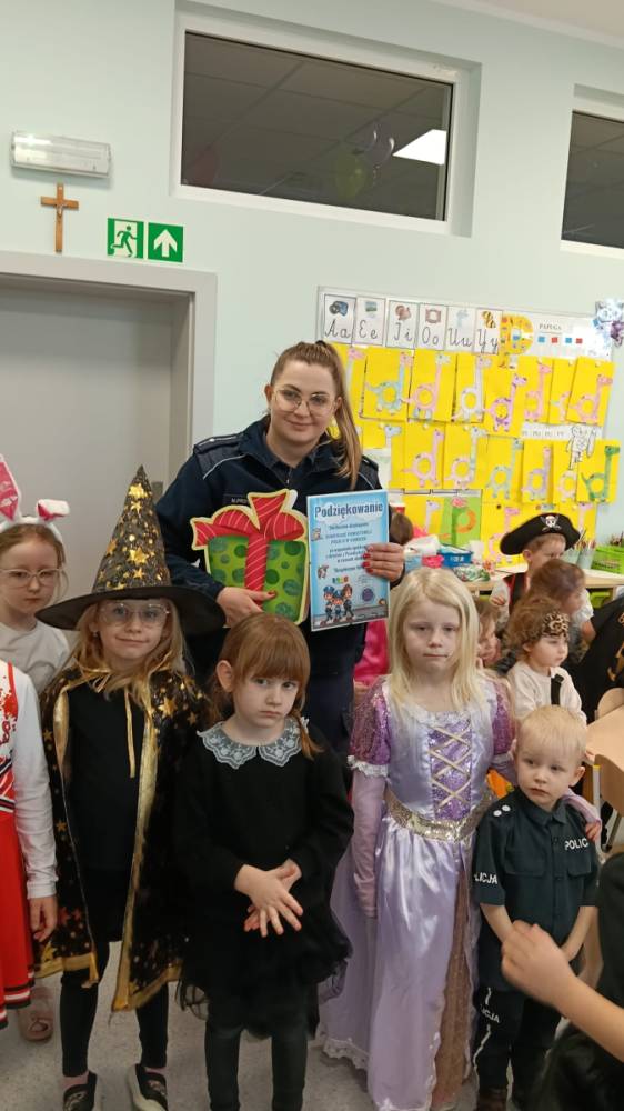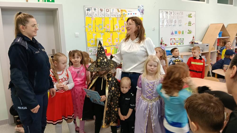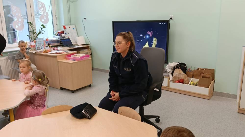 Przedszkolaki aktywnie uczestniczyły w rozmowie, chętnie odpowiadały na pytania i dzieliły się swoimi doświadczeniami. Spotkanie było cenną okazją do utrwalenia wiedzy oraz kształtowania odpowiedzialnych postaw.