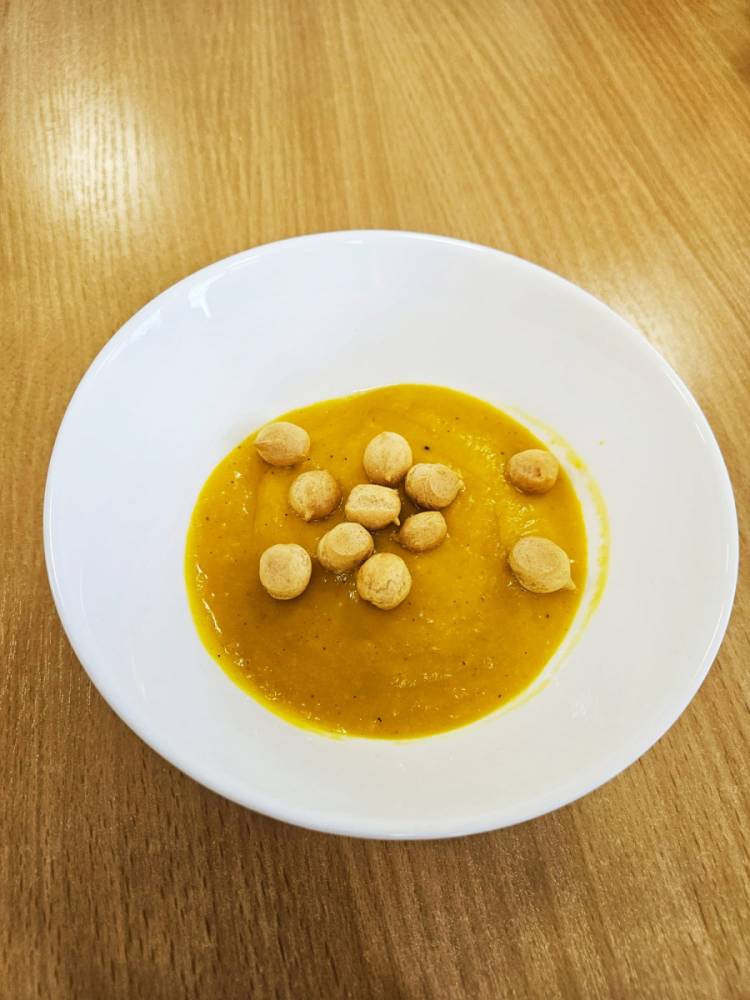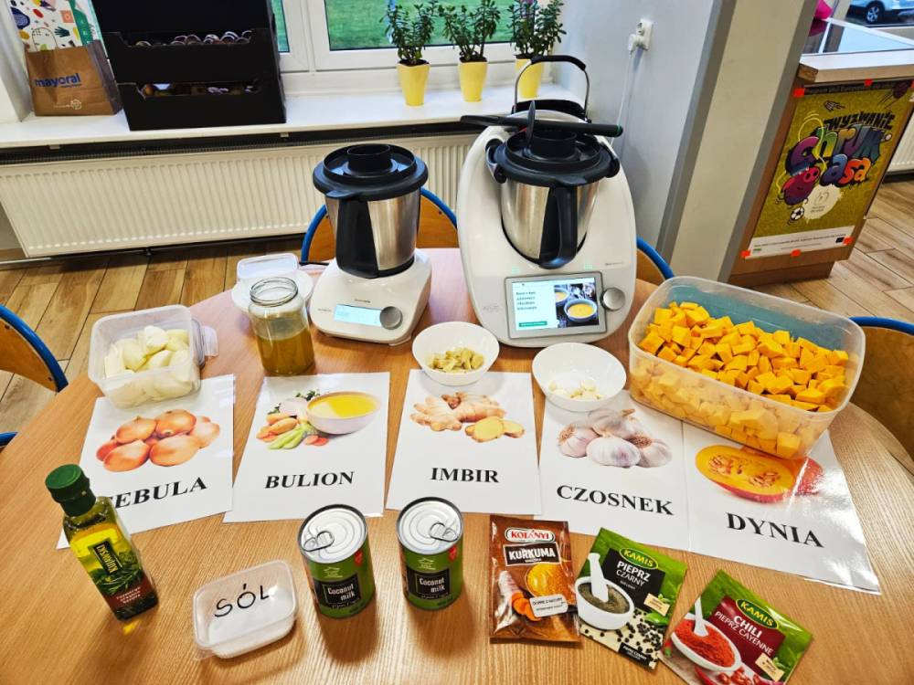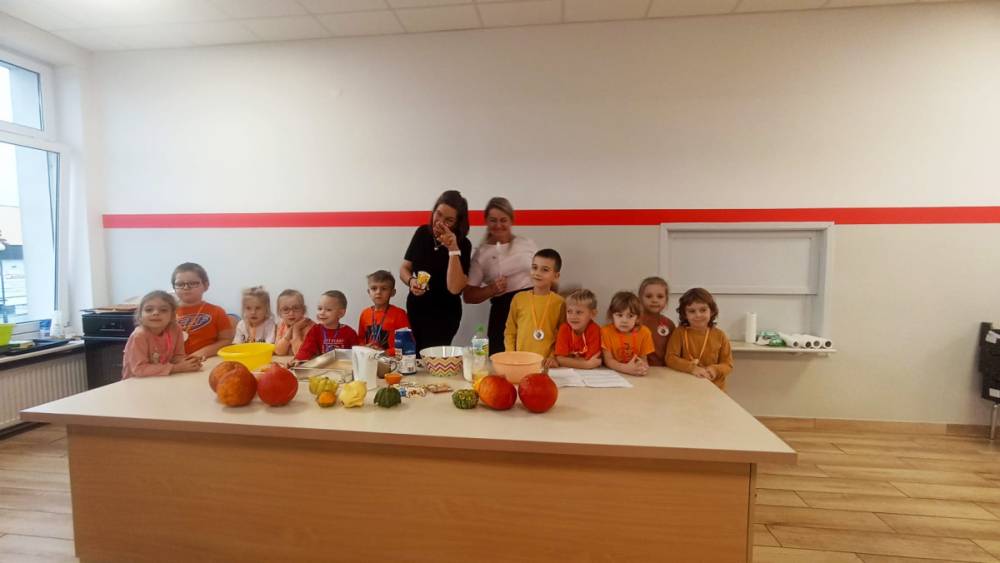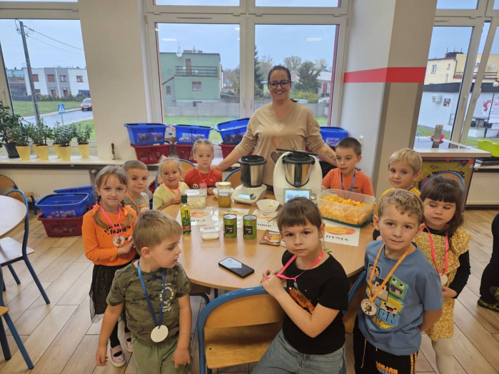Pani Karolina poprowadziła warsztaty kulinarne – mali kucharze wspólnie przygotowywali pyszną zupę dyniową, poznając przy okazji składniki i tajniki gotowania.