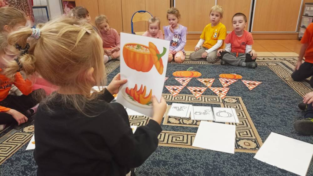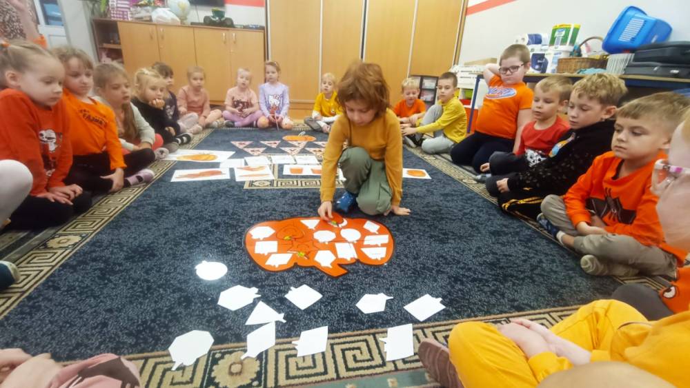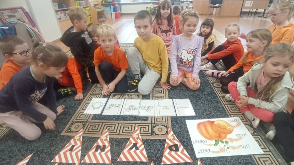 Na początku poznaliśmy budowę dyni oraz dowiedzieliśmy się, jak rośnie to niezwykłe warzywo. Dzieci układały napis „Święto Dyni”, rozpoznawały kształty i kolory, a także odkrywały, ile potraw można przygotować z dyni. Wśród zadań nie zabrakło również dyniowych figur geometrycznych – nauka przez zabawę sprawiła wszystkim mnóstwo radości!
