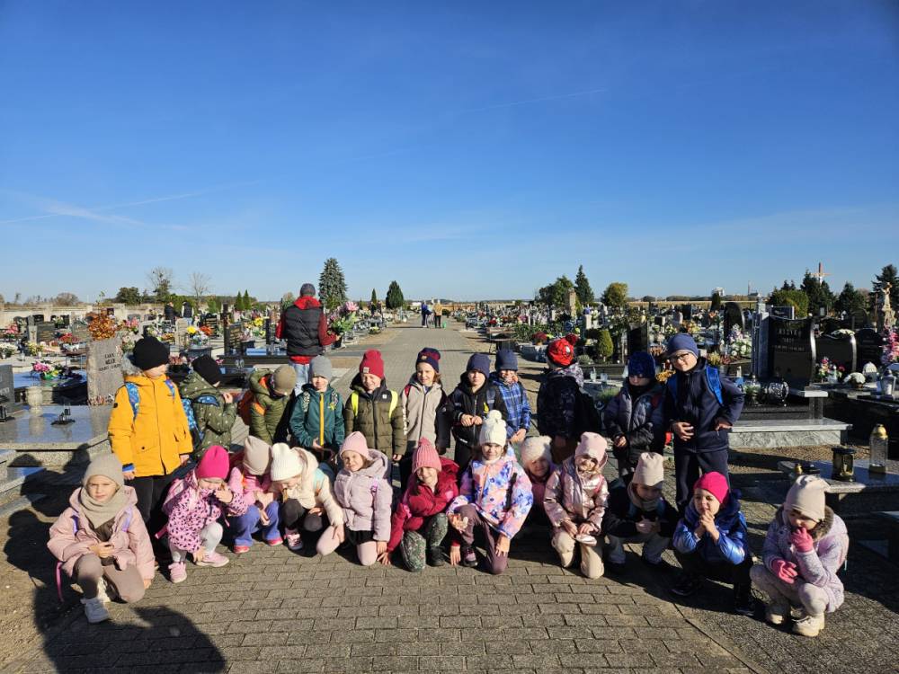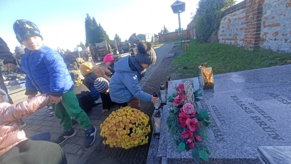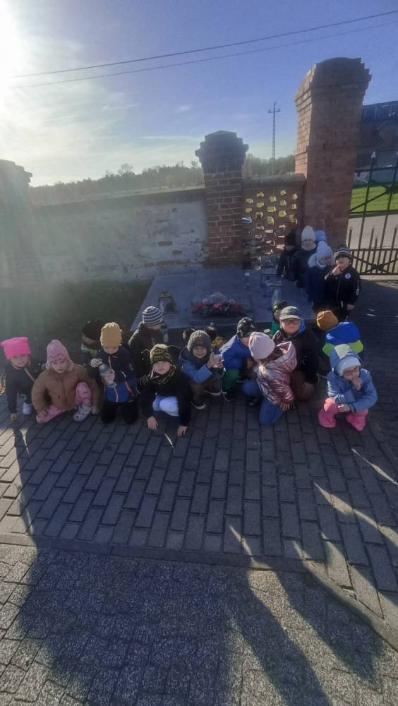 Z tej okazji dzieci z grup „Niedźwiadki” i „Sówki” wybrały się na cmentarz, gdzie odwiedziły groby żołnierzy walczących o wolną Polskę. Przedszkolaki zapaliły znicze, pomodliły się i z powagą oddały hołd poległym, ucząc się, jak ważna jest pamięć o przeszłości i wdzięczność za wolność.