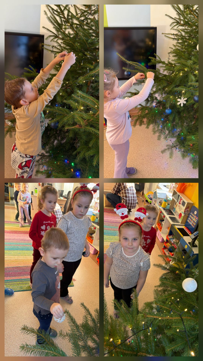 Grudzień jest specyficznym miesiącem związanym z tradycjami dotyczącymi Świąt Bożego Narodzenia. W naszej grupie, przygotowania rozpoczęliśmy od ubrania prześlicznej żywej choinki, za którą jeszcze raz bardzo serdecznie dziękujemy rodzicom Zosi. Na naszej choince znalazły się tradycyjne ozdoby choinkowe oraz własnoręcznie zrobione przez dzieci i rodziców. Przy okazji ubierania choinki przypomnieliśmy sobie jak się robi znany wszystkim łańcuch z kolorowych papierów. Z tym zadaniem świetnie poradziły sobie nawet młodsze dzieci.