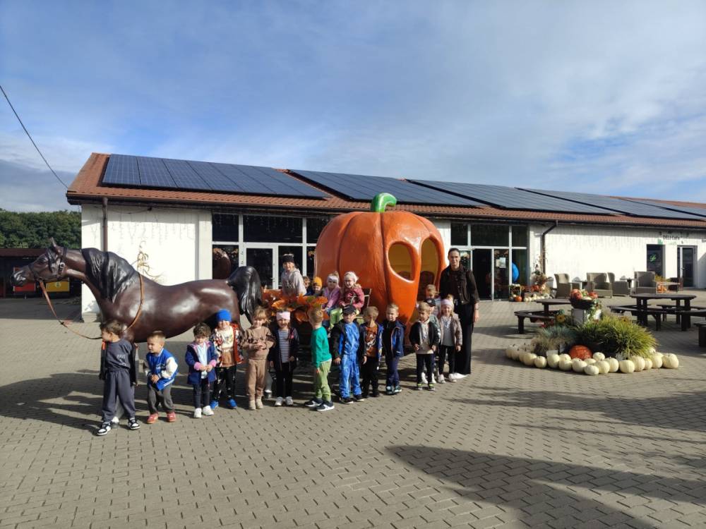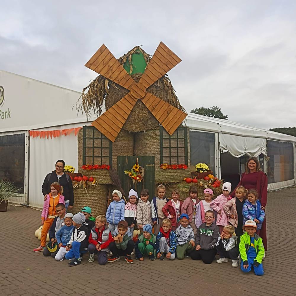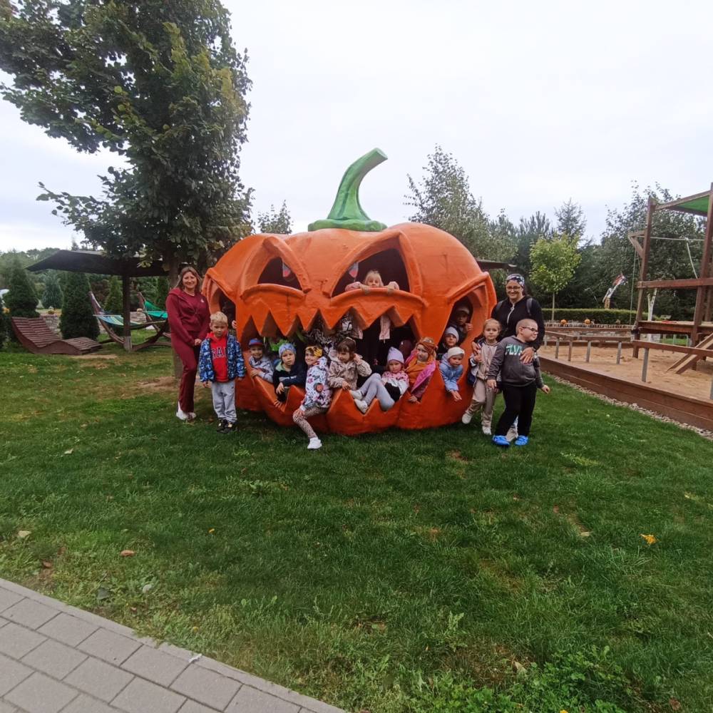 Dzień rozpoczął się przejazdem autokarem, po którym dzieci zjadły wspólne śniadanie, by nabrać sił na cały dzień wrażeń. Następnie grupy wyruszyły na spacer ścieżką edukacyjną przez mini zoo i wioskę napowietrzną, a przejście aleją dyń wywołało mnóstwo uśmiechów i zachwytów. „Niedźwiadki” miały okazję spotkać się także z „Królem Julianem”, co było dla dzieci prawdziwą niespodzianką!
