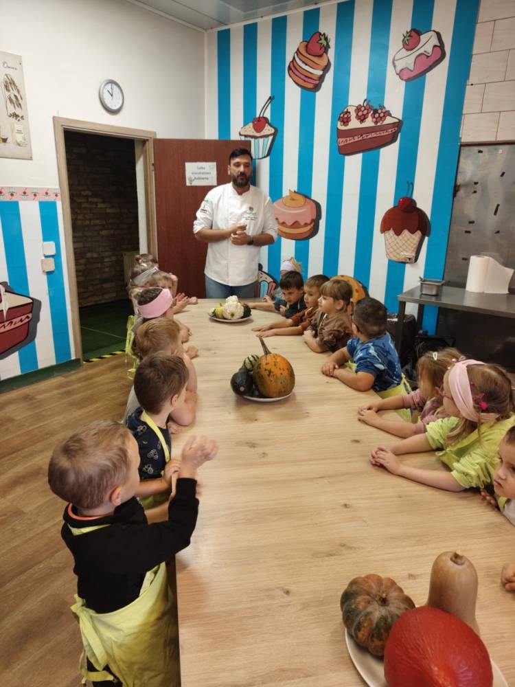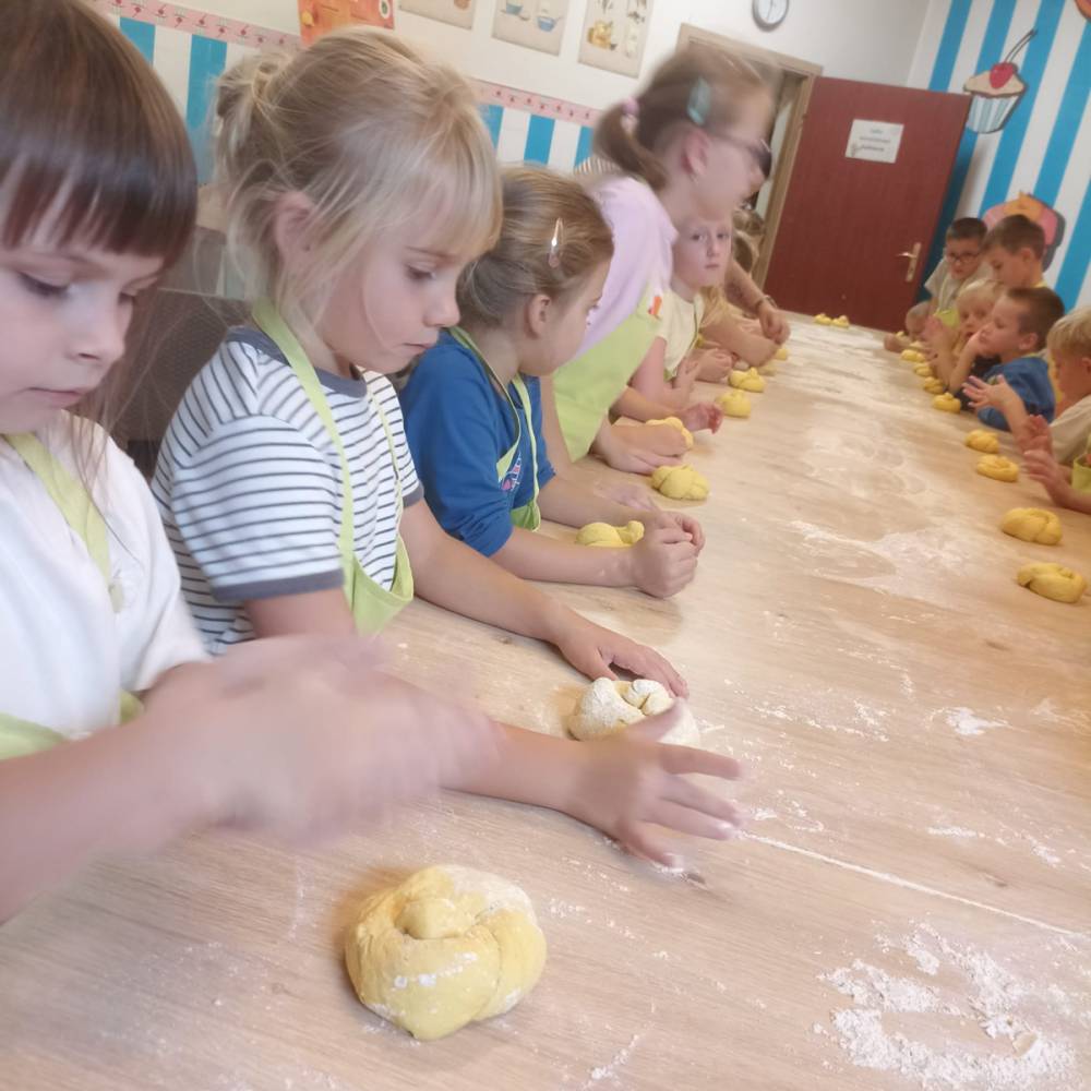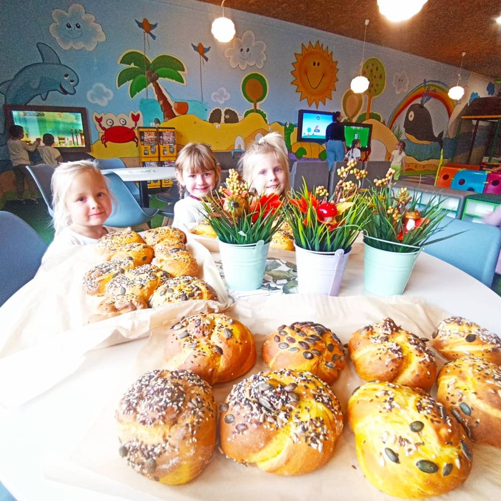 Jednym z ulubionych punktów programu były warsztaty kulinarne, podczas których dzieci samodzielnie piekły dyniowe bułeczki – zapach świeżego pieczywa towarzyszył nam jeszcze długo! Nie zabrakło również zabawy na wewnętrznym placu zabaw, gdzie dzieci mogły dać upust swojej energii i kreatywności.