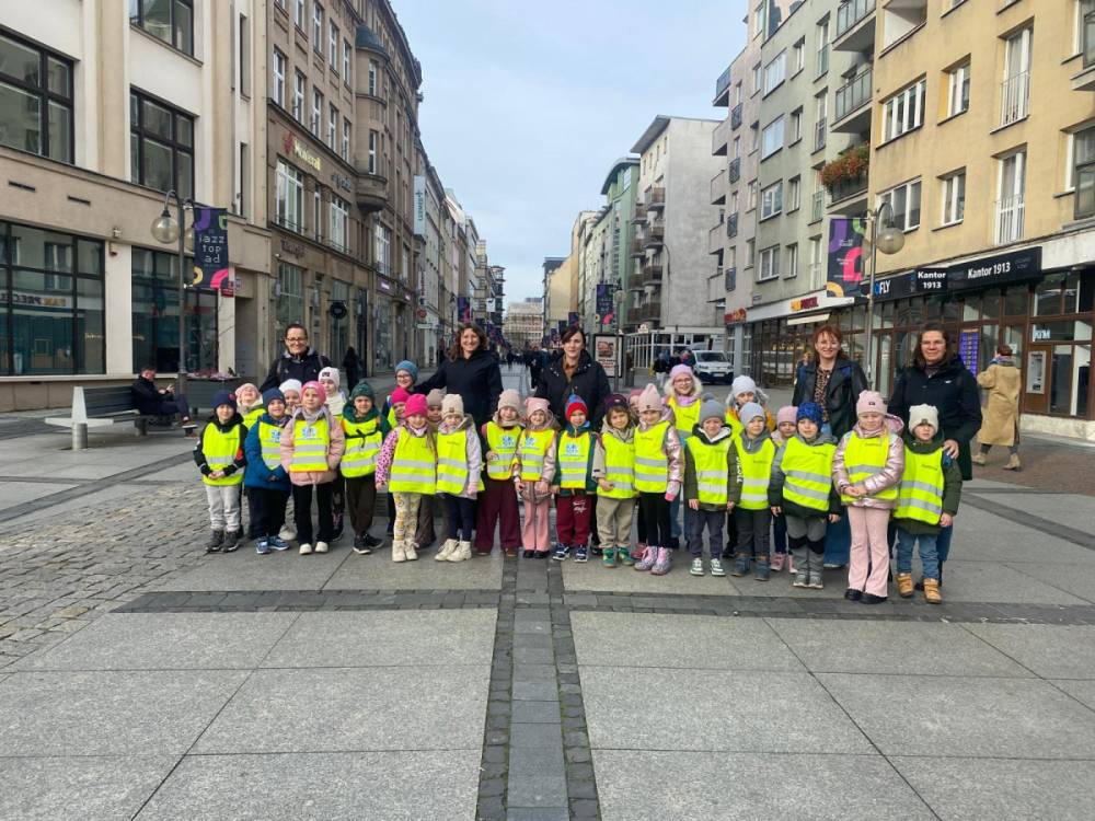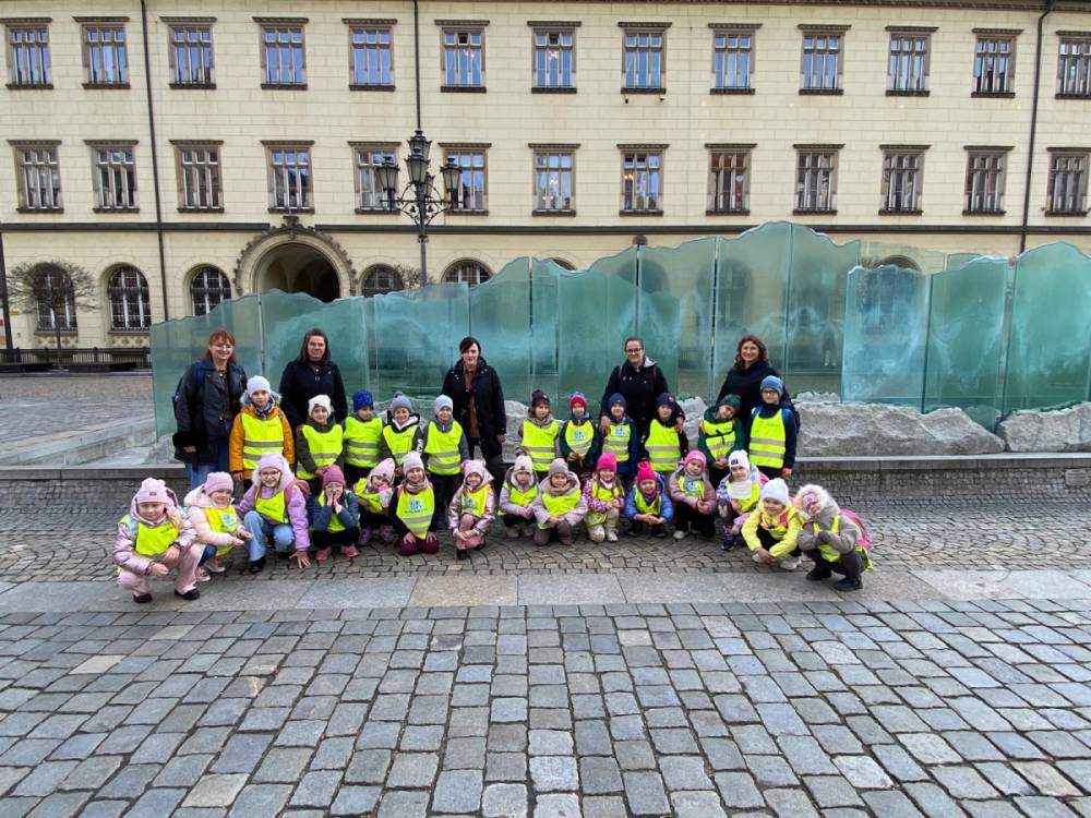 Po dotarciu do Wrocławia rozpoczęliśmy spacer na słynny wrocławski Rynek. Dzieci ćwiczyły zasady bezpiecznego poruszania się po chodniku i przejściach dla pieszych, zwracały uwagę na sygnalizację świetlną i znaki drogowe. Na Rynku podziwialiśmy piękną, zabytkową architekturę, zatrzymaliśmy się przy słynnej wrocławskiej fontannie, gdzie zrobiliśmy pamiątkowe zdjęcia. Spacerując po Starym Rynku, dzieci zachwycały się kolorowymi kwiatami i miały okazję chwilę odpocząć na ławeczkach, przekąsić coś oraz poszukać i uwiecznić na zdjęciach rynkowe wrocławskie krasnale.